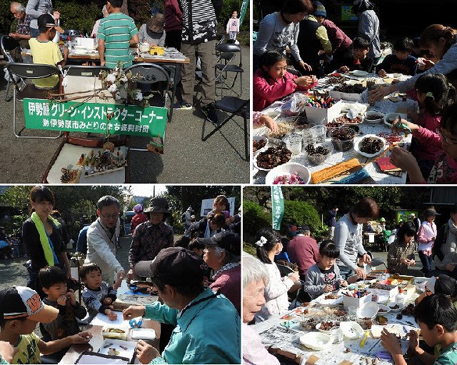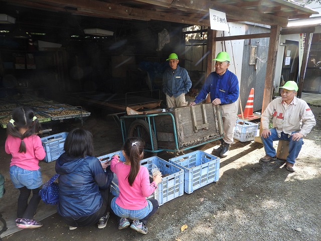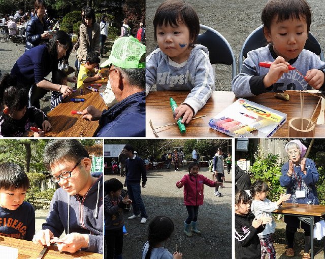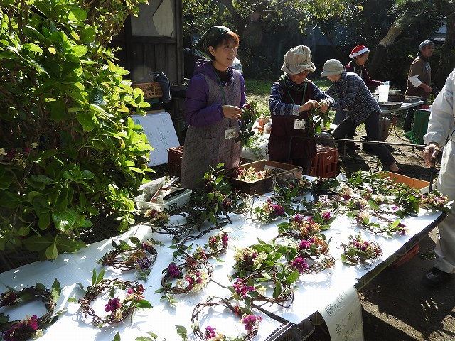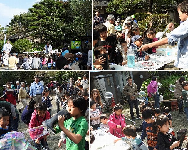 庭では、木の実細工(グリーンインストラクター)、シャボン玉遊び(こども科学館)、スーパー竹とんぼ飛ばし等があり、大いに遊びました。雨岳自然の会は、ポン菓子つくり、かんそう芋作り、クリスマスリースの展示を、雨岳ガイドの会は国指定有形文化財である山口家の案内をしました。