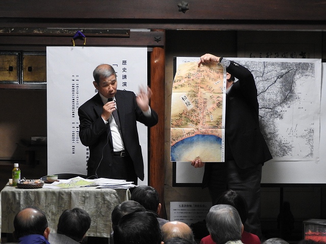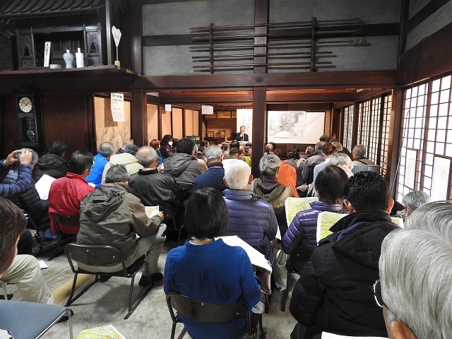 今日13時30分より雨岳文庫の主屋の座敷で、歴史講演会<平成28年度文化庁芸術振興費補助金事業>がありました。題名は