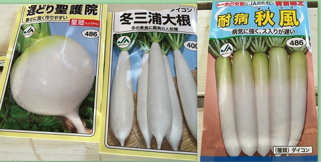 食用大根として、「聖護院」「三浦」「秋風」を播種しました。