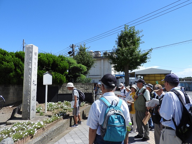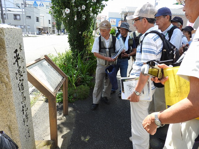 9月17日の、伊勢原とその周辺を歩くの6回目「須賀と平塚宿」の下見をスタッフで行いました。 コースは、 港稲荷神社―須賀湊の碑―札の辻跡―長楽寺と庚申塔ー三嶋神社―人魚の像「海の讃歌」ーお菊の塚ー江戸方見附と平塚宿ー脇本陣跡―高札場跡―本陣跡―西組問屋場跡―平塚の碑―お初の墓―春日神社―上方見附と広重の絵、です。