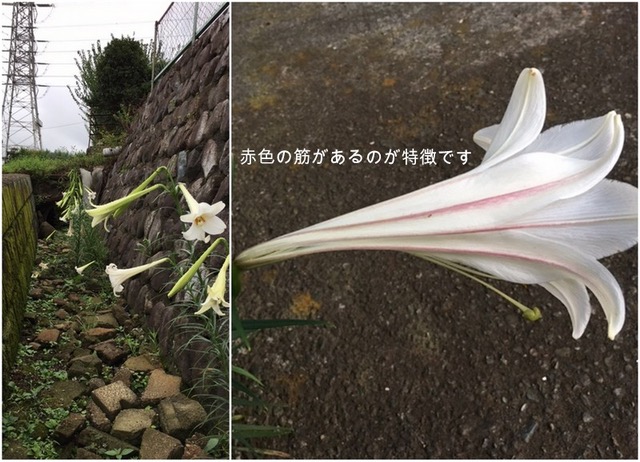 左側、排水口に咲いているユリは、最近年々増えてきた外来種の「シンテッポウユリ」です。