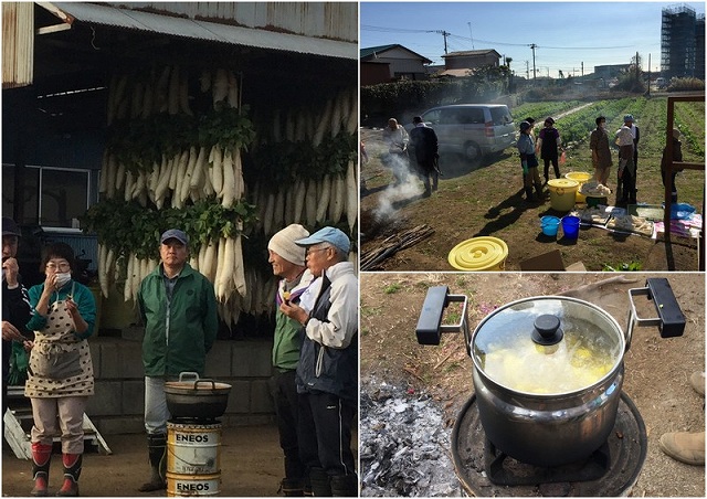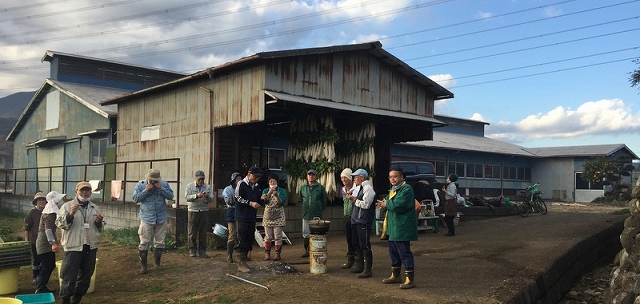 旧牛舎の軒先に、大根約180本が干されているのがご覧になれますか? 一仕事終わった後に、みんなで焼き芋をほうばっています。