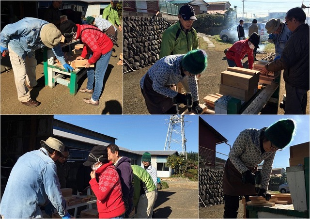 午前中、日本ミツバチ用の巣箱作りがありました。養蜂家の西村先生と斎藤さんのご指導のもと2時間ほどで完成しました。