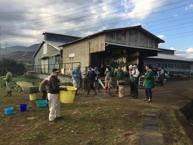 大根、ブロッコリー、白菜、なば菜などの収穫物をお土産に。この日は夕方より忘年会が開催されました。