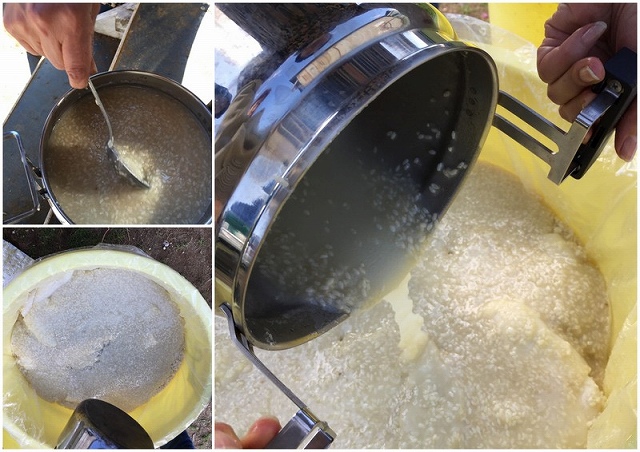 片方の樽は、米麹と砂糖を温水で混ぜ合わせ60℃で2時間発酵させてから液状になったものを入れました。
