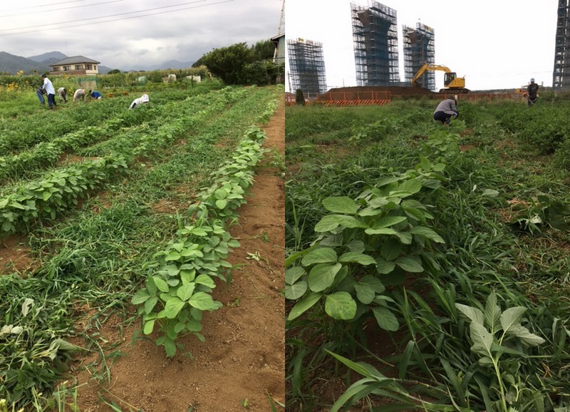 畑は一面雑草だらけです。作物が間に見え隠れしていました。枝豆の残りを収穫したり、マルチを撤去したりしました。