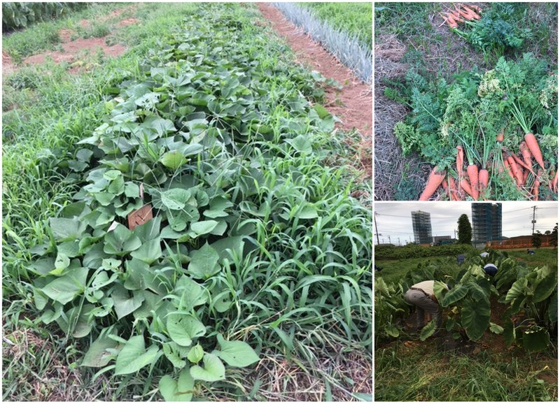 サツマイモがツルを伸ばし、里芋が育ち、人参が収穫できました。