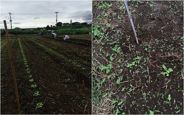 1週間前に播種した大根の間引き。生育不良を除き、3本残して手で土を寄せる作業をしました。
