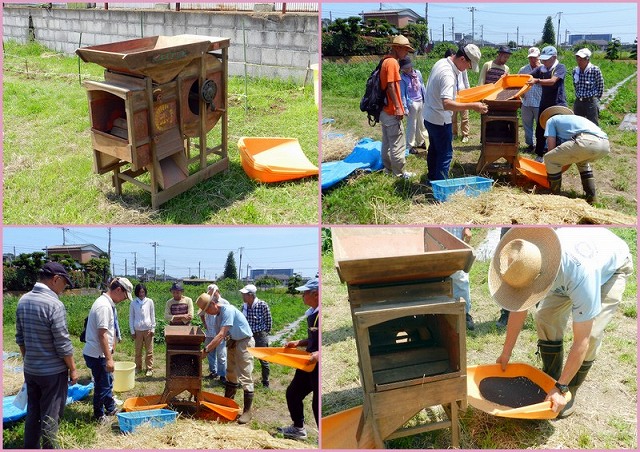 唐箕(とうみ)を使って、細かいゴミなど、 不要な軽いものを風で飛ばし種だけとりだします。足踏みが原動力です。
