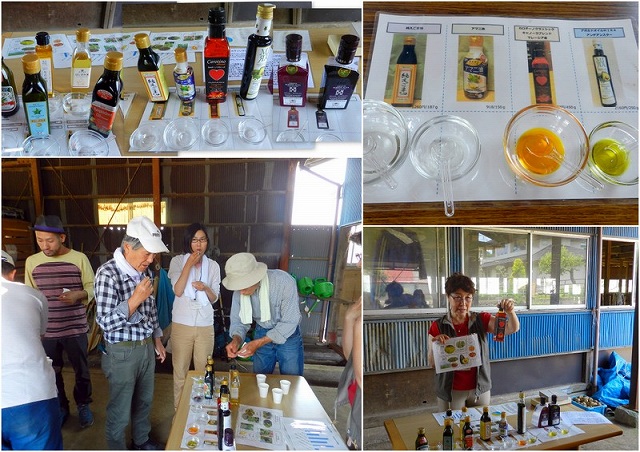 西富岡の畑の菜種油のほかに11種類の油をテースティング。今回はスペイン製の辛味のあるオリーブオイルを用意してみました。
