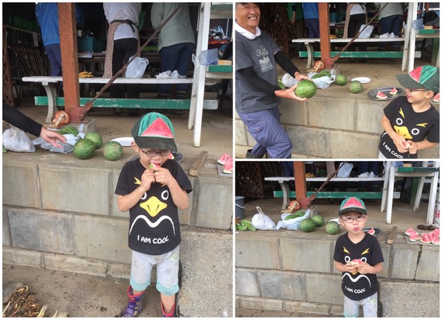 採れたてスイカを スイカキャップをかぶり “I AM COOL”のTシャツを着た坊やと一緒に食べました。