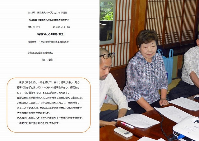 午後の講座は、神奈川県の「ふるさと生活技術指導士」の柏木菊江先生による『地元に伝わる農産物の加工』講座。