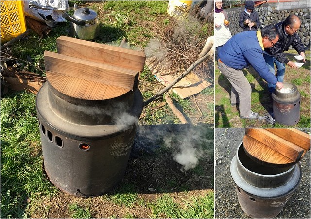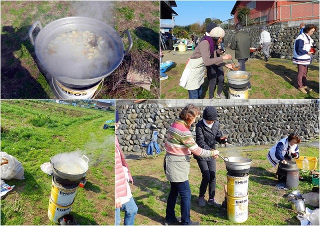 畑の収穫物(大根、里芋、ネギ、にんじん等)をぶっこんで、ペール缶で会員が作ったロケットストーブで味噌汁を。