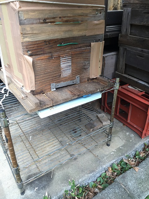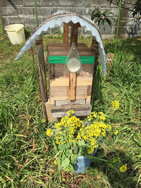 防寒対策を施された巣箱。ハチの姿は少なくなりましたが、元気のようです。