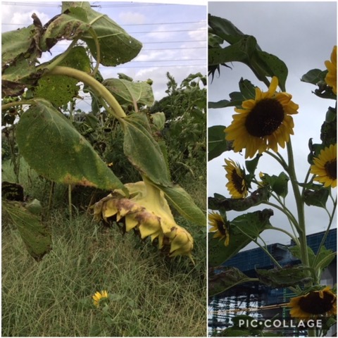 ヒマワリは2種類あり ど根性ひまわり(左)と枝咲き(右)を区別して タネを牛舎に乾しました。
