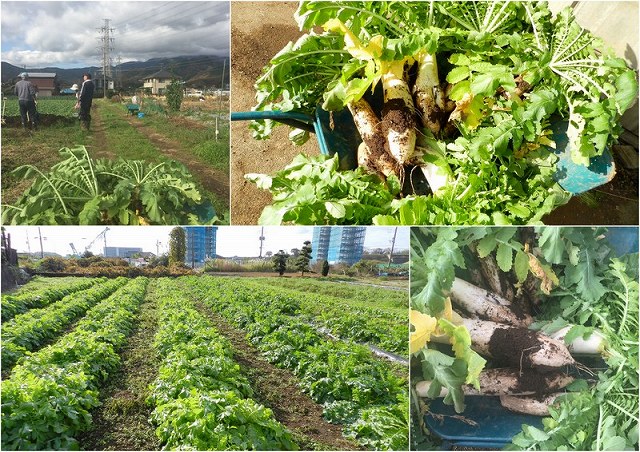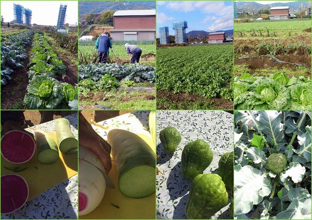西富岡の畑は、白菜、ブロッコリー、青梗菜、ホウレンソウ、コマツナ、サツマイモ、里芋など採れ頃を向かえています。