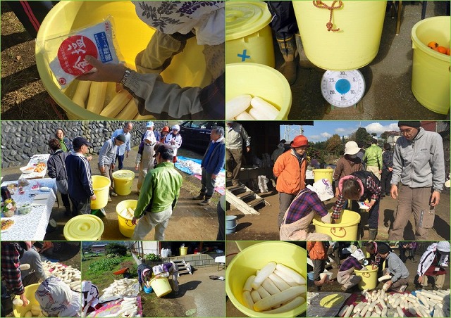 収穫の喜びをお祝いする前に、9月13日に播種した品種「大くら大根」を1畝(約140本)収穫して、畑の井戸で洗い、みんなで皮むきをしました。お隣の畑で収穫していた大根はすっきり伸びていましたが、当方の大根はちょっとひねていました。