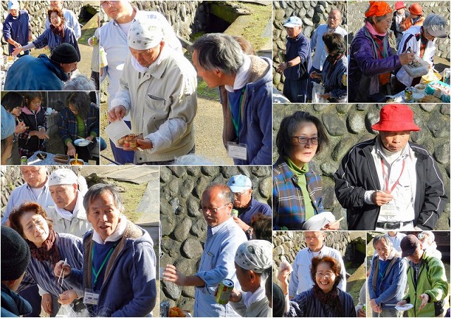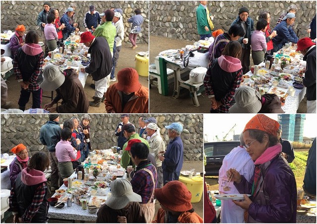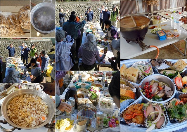 その後は、恒例の畑で収穫を喜び会いました。トン汁は畑の収穫物がたっぷりです。(吉羽先生ご夫妻担当)、実がびしり詰まった煎り落花生(山口先生の梅干し台で、天日干しにしていただきました。)ひょっこり芋、採れたて大根のサラダ、お近くの柿園でいただいてきた柿等。