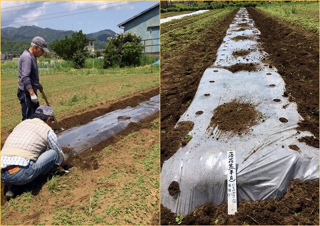 会員からの栽培希望の多かった伊勢原名物落花生を植えるための畝をマルチで作りました。