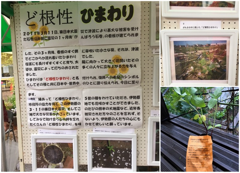 会場では『ど根性ひまわりの苗』の無料配布がありました。震災で流れ着いた種が塩害にも負けず育ち、花を咲かせたその種子で、これは七代目になるそうです。