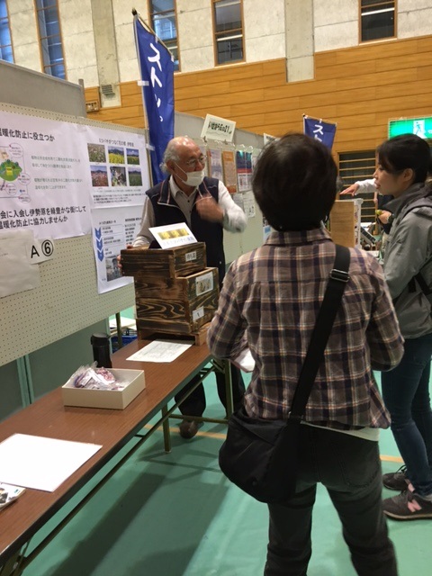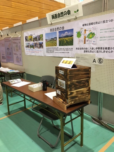 雨の中、公園緑花祭りに協賛して環境展が開催され、自然の会も例年通り出展しました。13日は雨で野外の行事は中止になりましたが、体育館内の行事は15時まで開かれ、500名前後の方が訪ねてくれました。14日は天候も回復し、雨岳自然の会は日頃の活動紹介とみつばちの待ち箱の展示をしました。