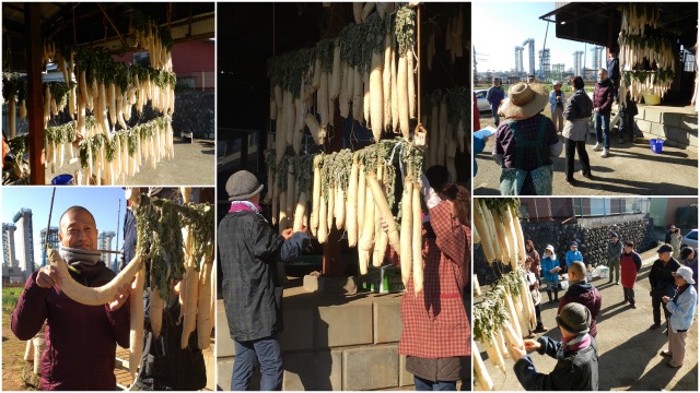 市販の沢庵のほとんどは、調味液を利用して浸透圧で水分を抜いているそうで、天日干しの大根を利用する昔ながらの製法は少なくなったようです。雨岳自然の会では牛舎の軒先を利用し、大根の両端をもってくるりと回る程度に干すことができました。