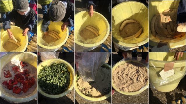 A.B.Cの三つの樽に分け、A樽の塩分濃度は3%、B樽3.5%、C樽4%とし、それぞれ1ヶ月、1ヵ月半後、ほぼ2ヶ月後に樽明けをする予定です。各樽に糠7Kg、唐辛子、昆布、干し椎茸、ザラメ、生柿を入れ、ありったけの重石をかけています。