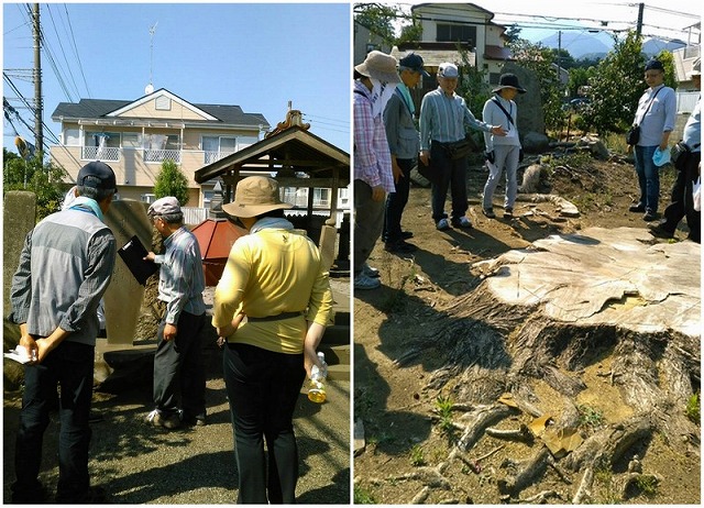 太田道灌の短歌の記念碑の説明を受ける受講生。太田道灌の墓地の周りにあった大木が全て切り取られていました。