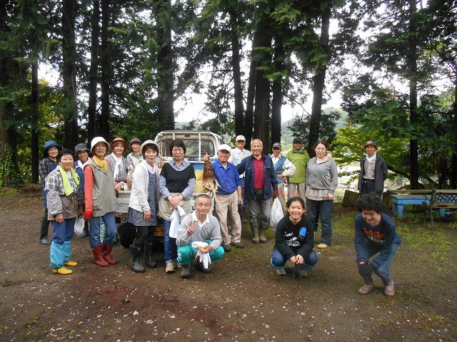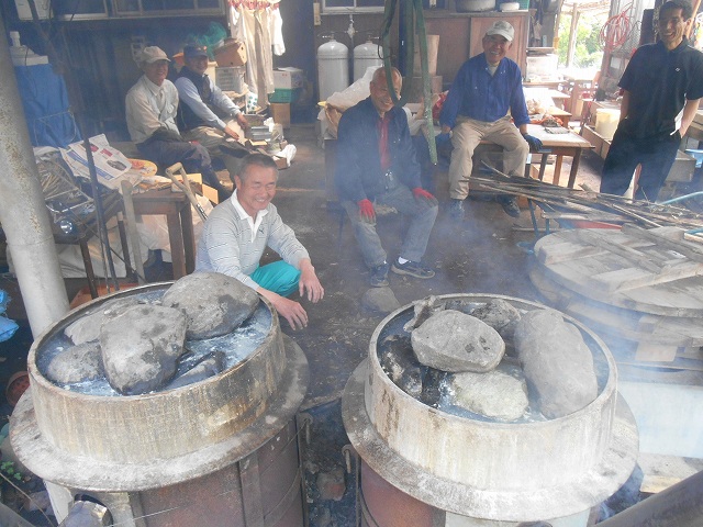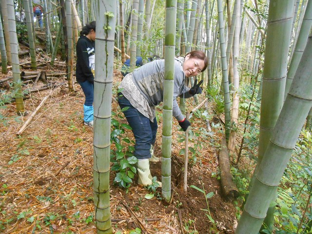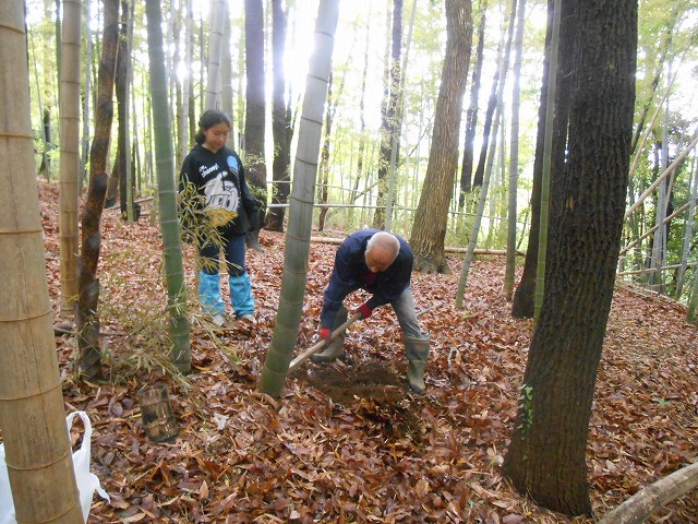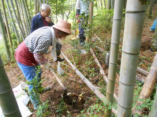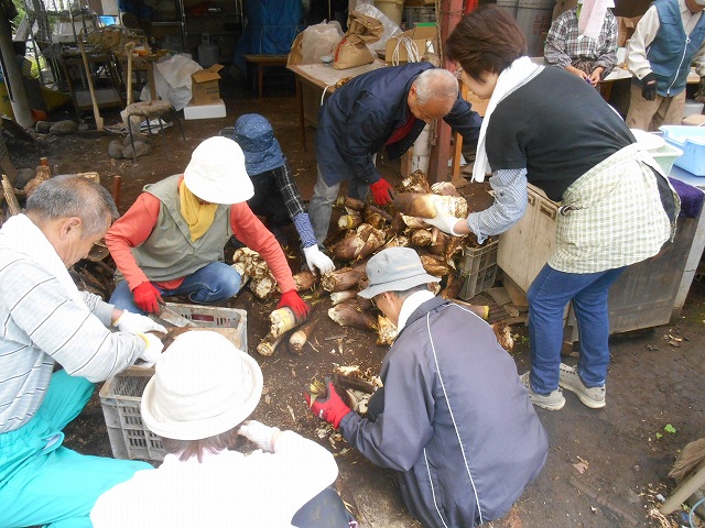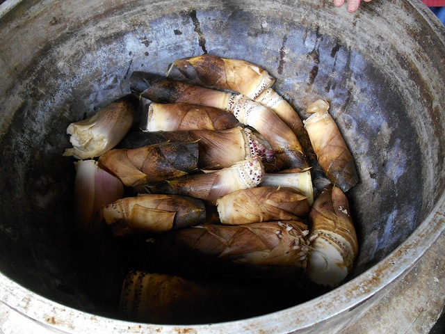 山口家の竹林でみんなで筍掘りをしました。大きな釜に2杯分も取れ、さっそく大釜でゆでました。