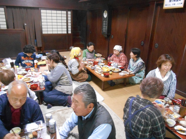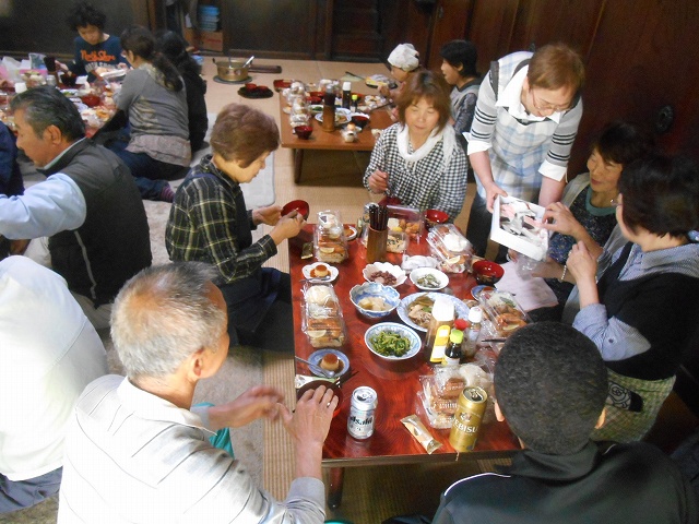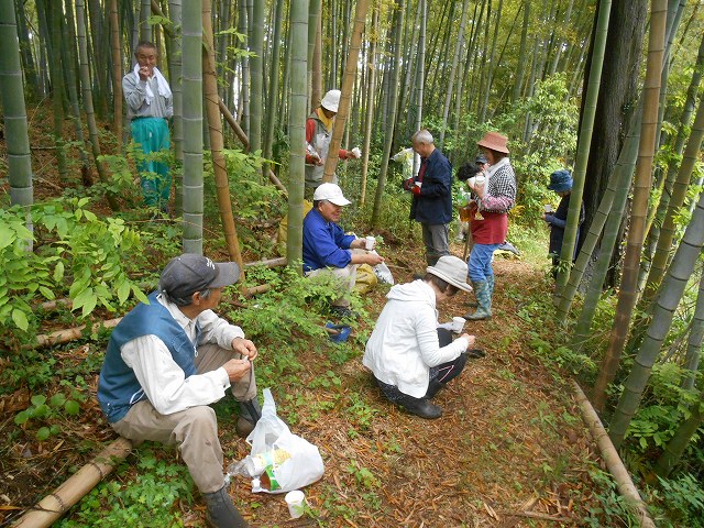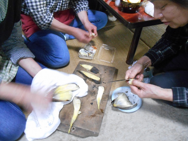 昼は筍ご飯や筍の煮物、から揚げ、三つ葉のおひたし、持ち寄ったお菓子などを頂きました。最後に焼きあがった筍が特に美味でした。
