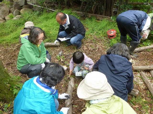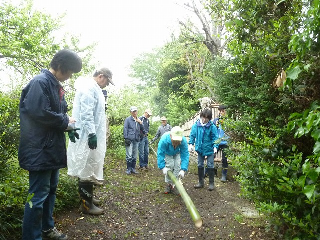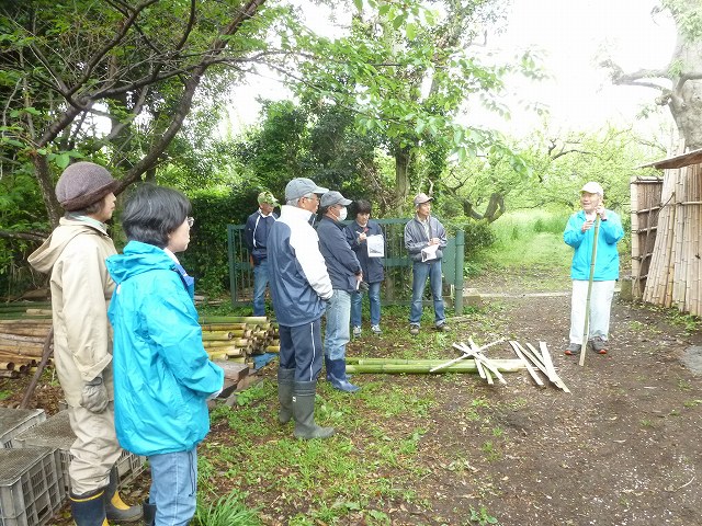 小雨が降るあいにくの天気になりましたが、雨岳自然の会の皆さん主体で3回目の竹垣つくりをしました。瀬戸先生に建仁寺垣の作り方を学び、実際に作ってみました。
