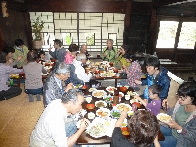 昼食、タラの芽など山菜のテンプラ、筍の煮物、三つ葉のおひたし、さつま揚げ、みそ汁など