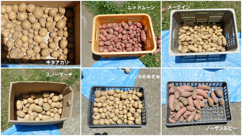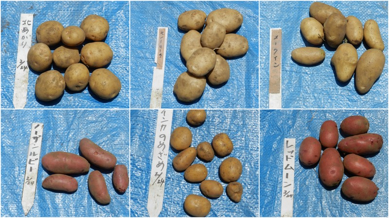 ●キタアカリ:男爵の系列なので、ゴツゴツした感じで、果肉は黄色くホクホクしています。男爵よりも甘みが強く、クリジャガイモとも呼ばれているそうです。●スノーマーチ:雪の頃から、3月まで貯蔵中に甘みが増すというジャガイモで、皮が剥きやすく、ホクホクで白い果肉はクリーム料理があうそうです。●インカのめざめ:重さが平均50g前後と小ぶりのジャガイモで、果肉は綺麗な黄色をしていて、加熱調理後も濃黄色が活かせ、きめの細かいジャガイモです。