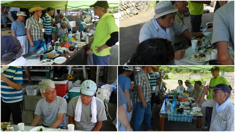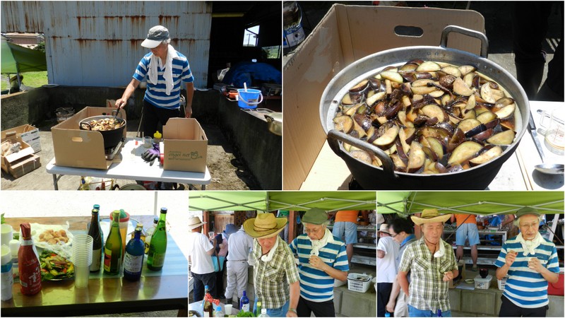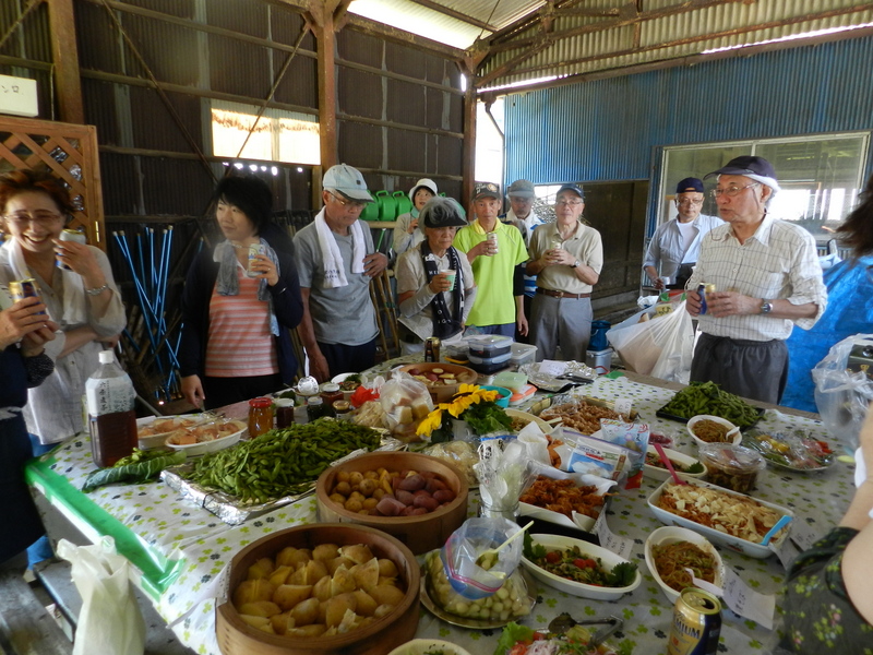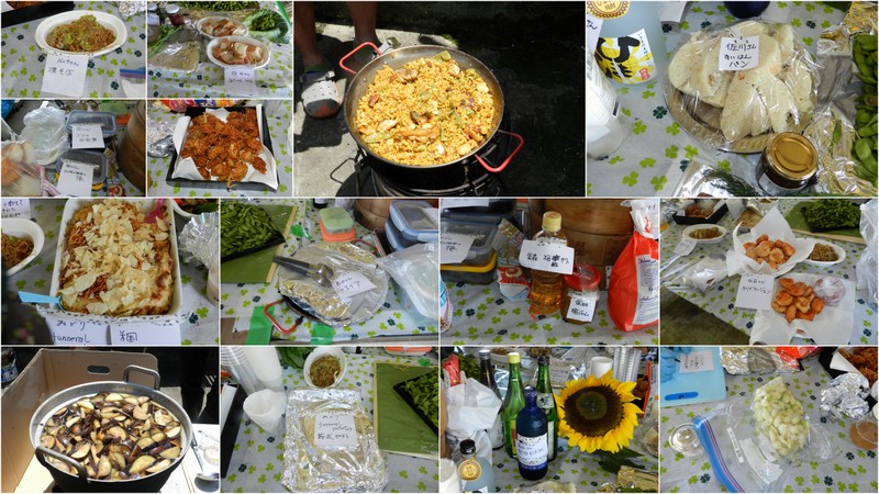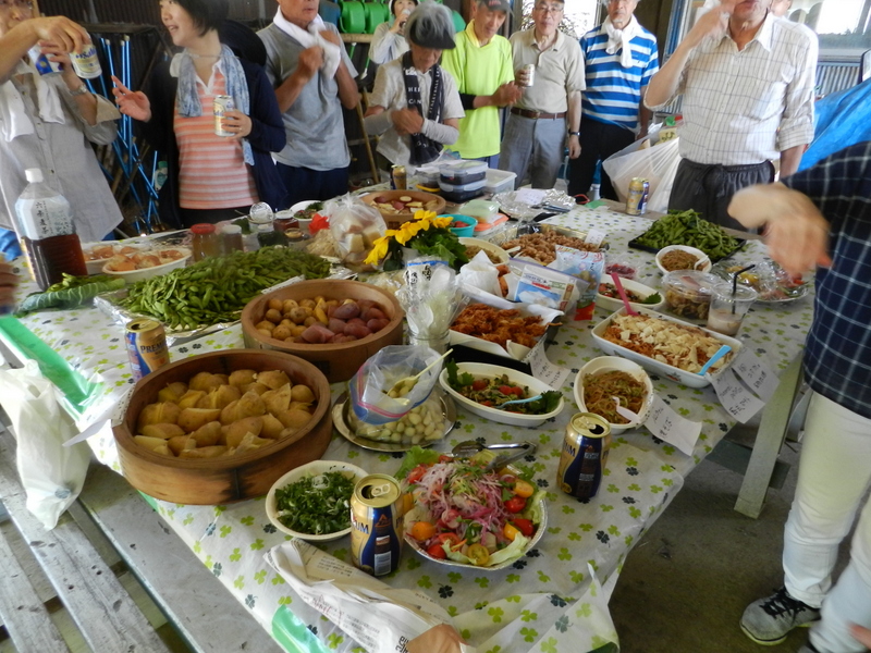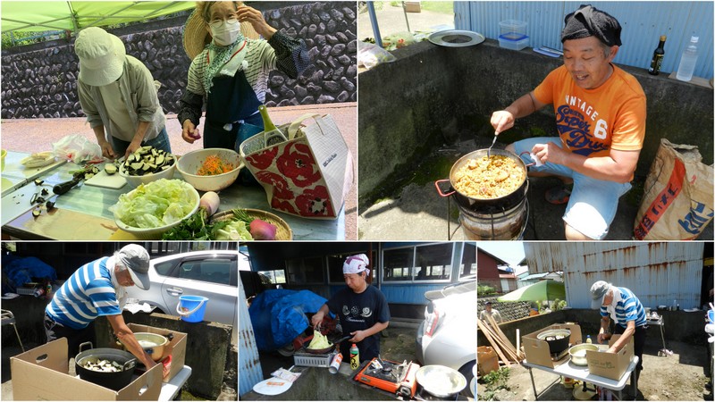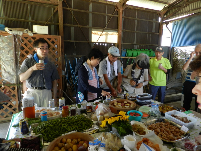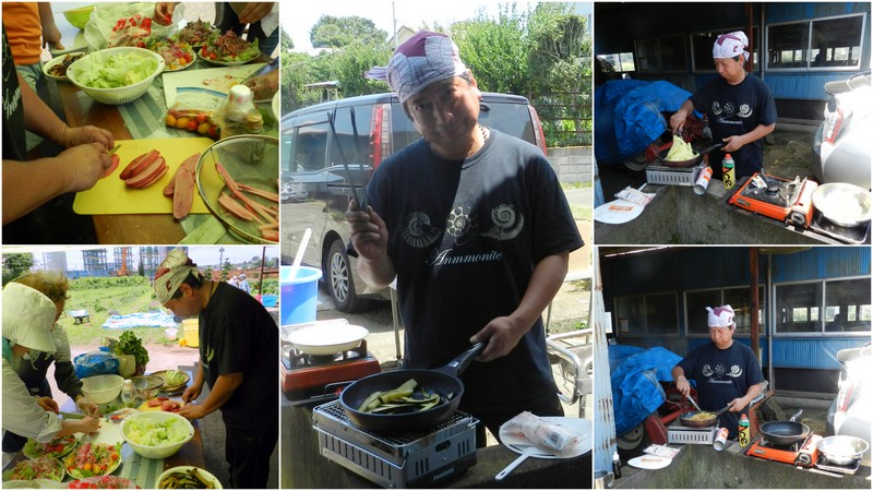 雨岳自然の会には、調理上手がたくさんいます。それぞれの畑で収穫されたキャベツ、ナス、トマト、シソ、パクチー、アーティーチョーク、スイスチャードビーツ、バジルなどなどを使った料理が供されました。