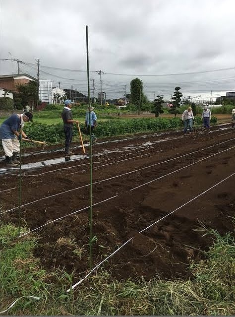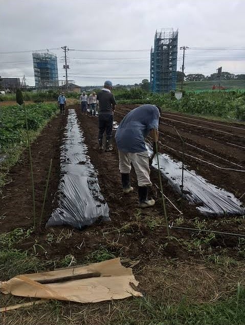 小澤さんが機械で耕作してくださった後に、畝作り、肥料投入、穴開けマルチの敷設をしました。