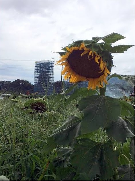 ヒマワリも大きく咲きました。後方には第2東名が建設中です。
