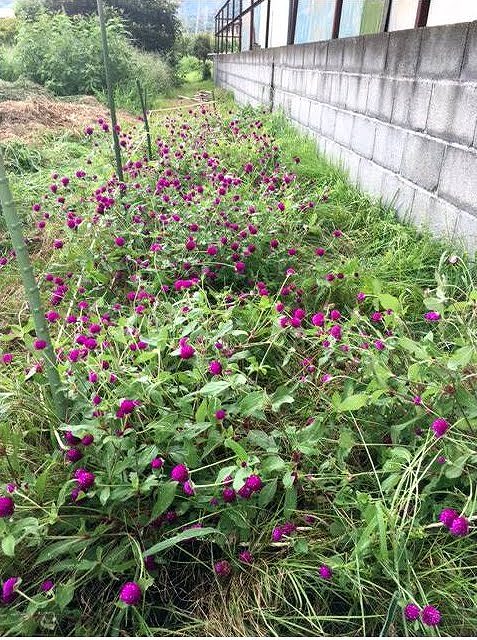 牛舎の横に植えられた「千日紅」が、色鮮やかに咲いてます。花はドライフラワーにする予定です。