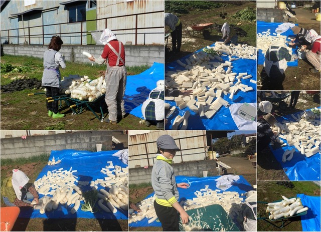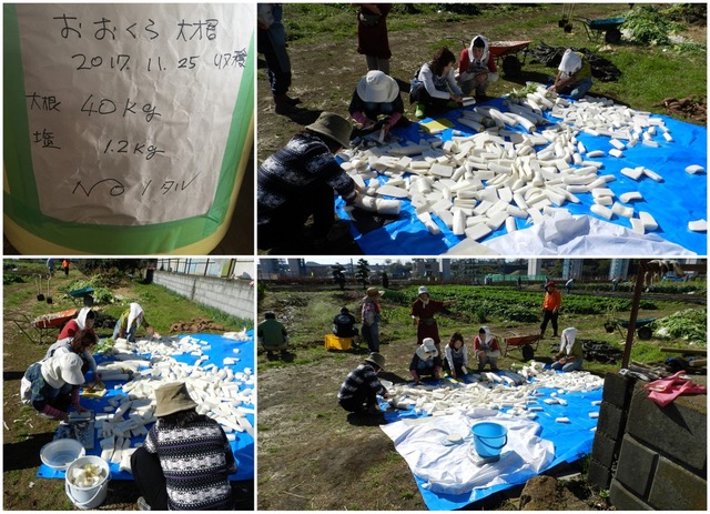 みんなで皮むき器を持参し、次々と剥きました。今年は一本漬けでなく、小さ目に切って塩漬けにしました。