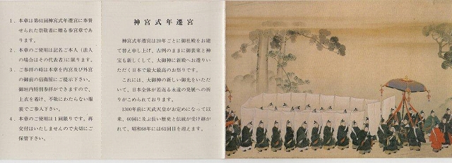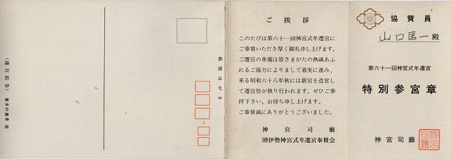 1)ご当主・山口様へ、伊勢神宮から頂いた式年遷宮の「特別参宮章」 (前回(H5)年)の発見。目にすること無い貴重な招待状です。