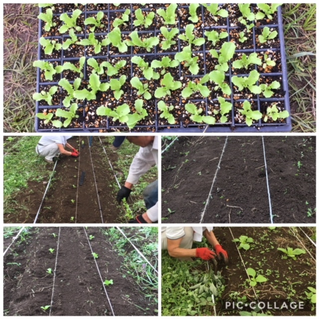 近くの専業農家の小沢さんに仕立ててもらったレタスの苗を植え付けます。