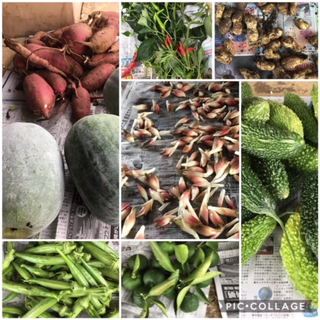 サツマイモ、冬瓜、ミョウガ、にがうり、おくら、青ゆず、唐辛子、試し掘りの落花生( 雑草に負けてしまいわずかの収量ですが。)