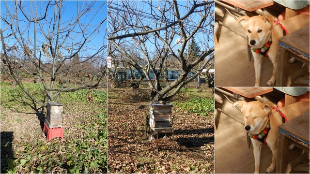 梅林の中のニホンミツバチの巣箱。雨岳自然の会ワンコ会員のぽろんちゃんも、無事受付業務を遂行しました。