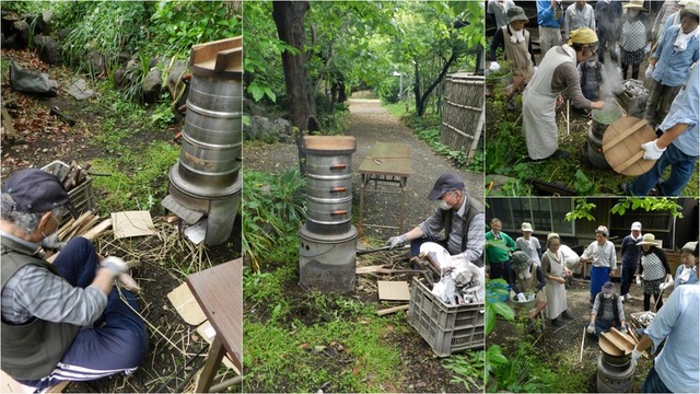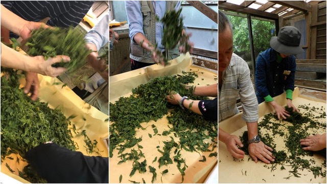 摘んだ茶葉を蒸す作業は、繊細でダイナミックです。火起こし係は吉羽先生、はまり役です。