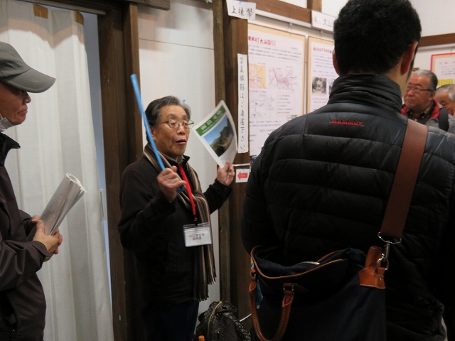 最初のご挨拶は田中米昭様がされましたが、川島先生が引率された方々ですので、説明員の横山と田中は緊張の中でのご説明でした。写真は川島先生スナップと田中米昭様の上棟幣の説明場面です。