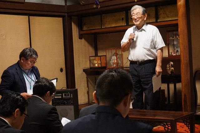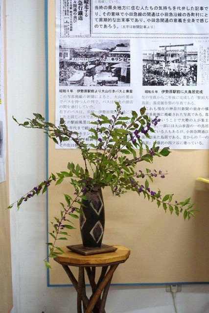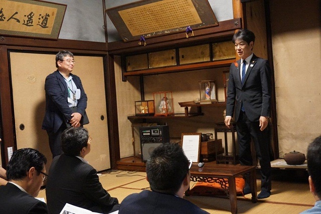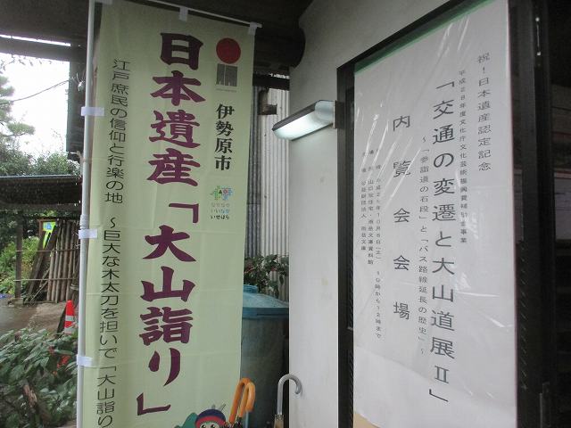野崎理事長の挨拶に続き、義家・文部科学副大臣、渡邊県議のご挨拶をいただきました。新聞記者の方や、大山道研究家で有名な中平様も熱心に私たちの説明に耳を傾けていただきました。また、阿夫利神社様、先導師・佐藤大住様からも展示のための納め太刀や行衣の貸与をいただき展示しました。